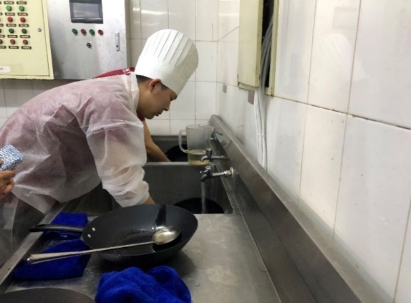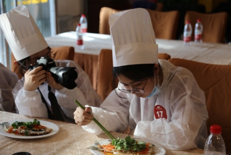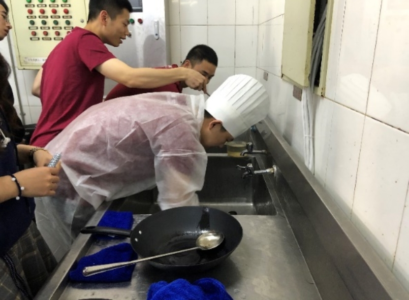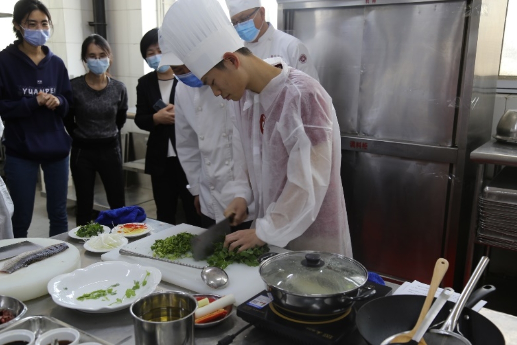 随后,王晓如为大家演示了“油浸鱼”的制作方法,指导同学们动手操作。同学们在指导下体验了食堂制作菜品的全流程,并烹制了自己在本课程上的第一道菜。