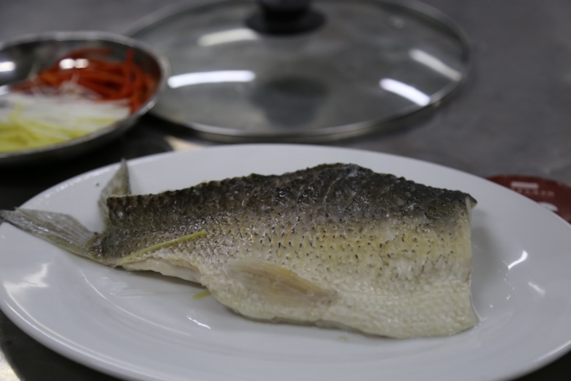 第二步摆盘:用笊篱将鱼沥干水份装盘,装盘规矩:左肚右背上头下尾。葱姜丝加胡椒粉抓匀放鱼背