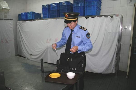 ![]() 卫生监督员进行现场抽样化验餐具