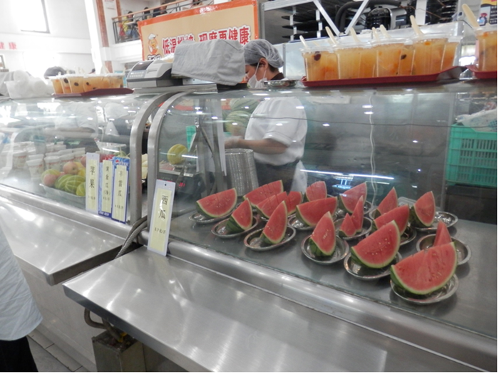 自2014年5月起,应广大师生要求,餐饮中心尝试扩大食堂水果供应量。为此,餐饮中心生产采购部(以下简称采购部)派专人负责水果采购工作,并根据水果品种和师生需求分析、制订采购计划,在市场发现新品上市,及时与食堂沟通,选择一个食堂先试销售,若该品种受到同学们的欢迎和认可,再将信息通知给其它食堂,做到全面铺开。与2014年相比,今年水果采购的品种更加丰富,由八、九个品种,增加至目前的二十一种。除一些高端、小众水果没有采购外,基本做到市场有的食堂就有。到目前为止,餐饮中心日均水果采购量由去年的每次1500斤到现在的8000斤,预计高峰将达到10000斤,截至2015年4月底,目前已累计采购水果90000斤。