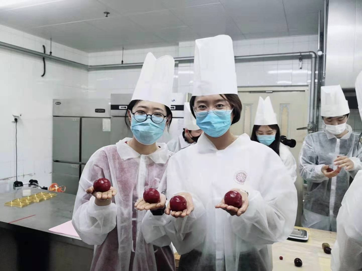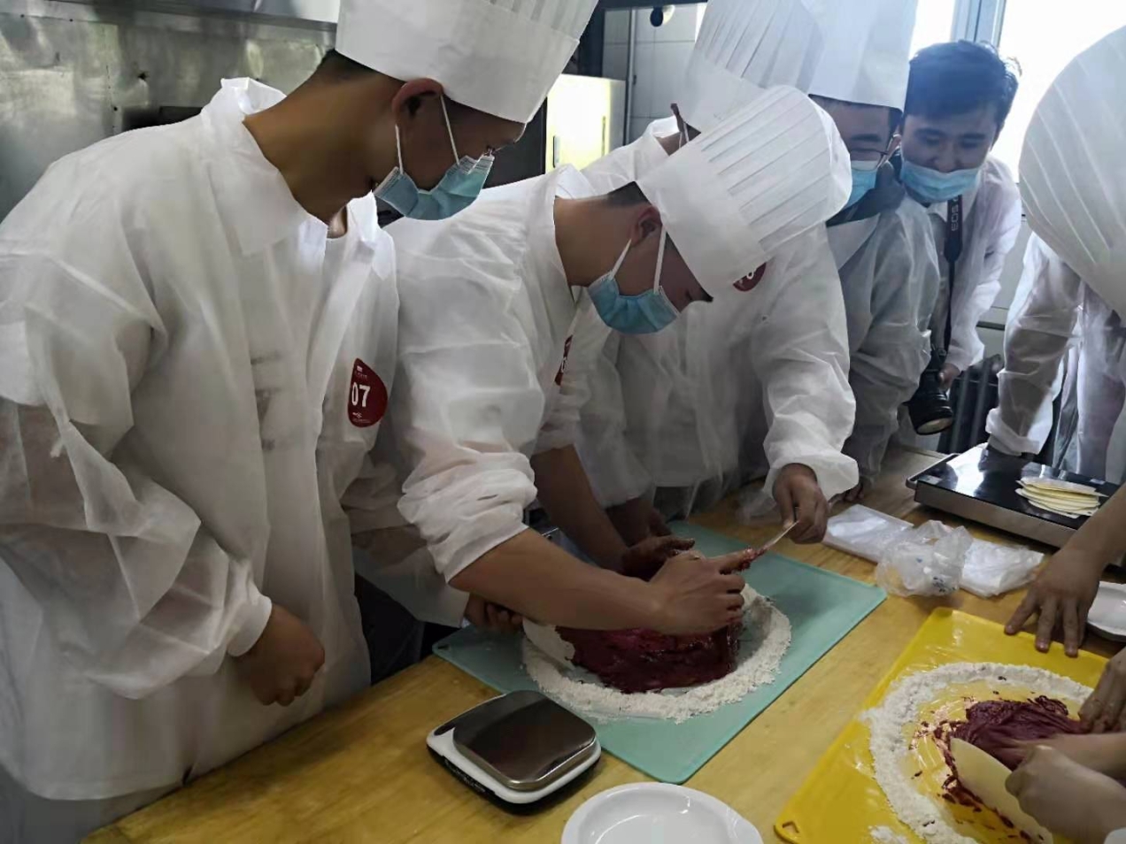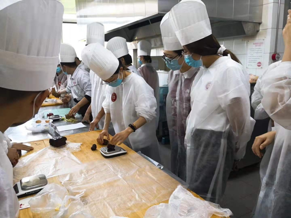北大喜饼,对于同学们来说既熟悉又陌生。为了增加这堂课的互动性和体验感,张丽颖老师负责讲授操作步骤和指导大家完成糕点,时玉甫老师全程操作演示。