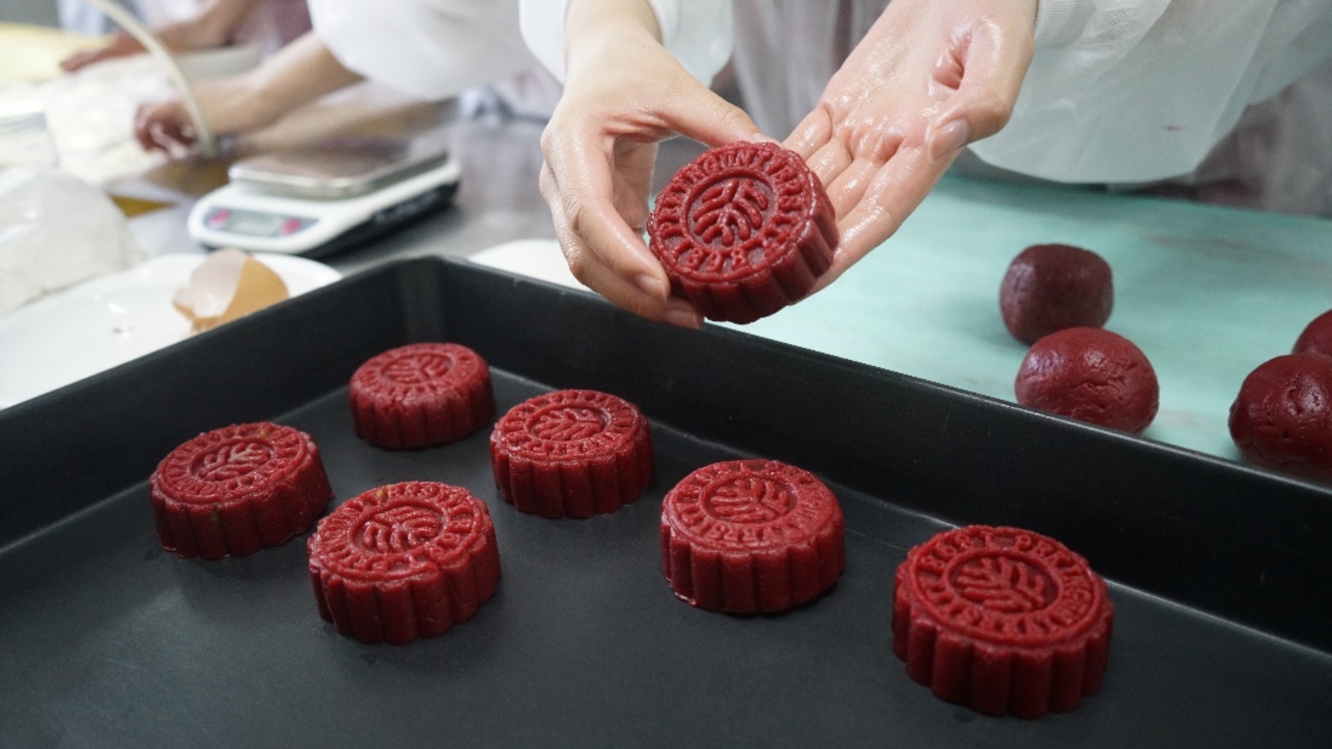 首先挑选鸡蛋一枚,将称好的面粉过筛,“开锅”(即面粉围成一圈)放在硅胶垫上。把称好各种面粉、原料放入“锅”内,用手掌的根部把擦匀、压匀,直到面团变光滑。最后将做好的面团分成面剂,馅料和面剂按照一定比例制作称重。