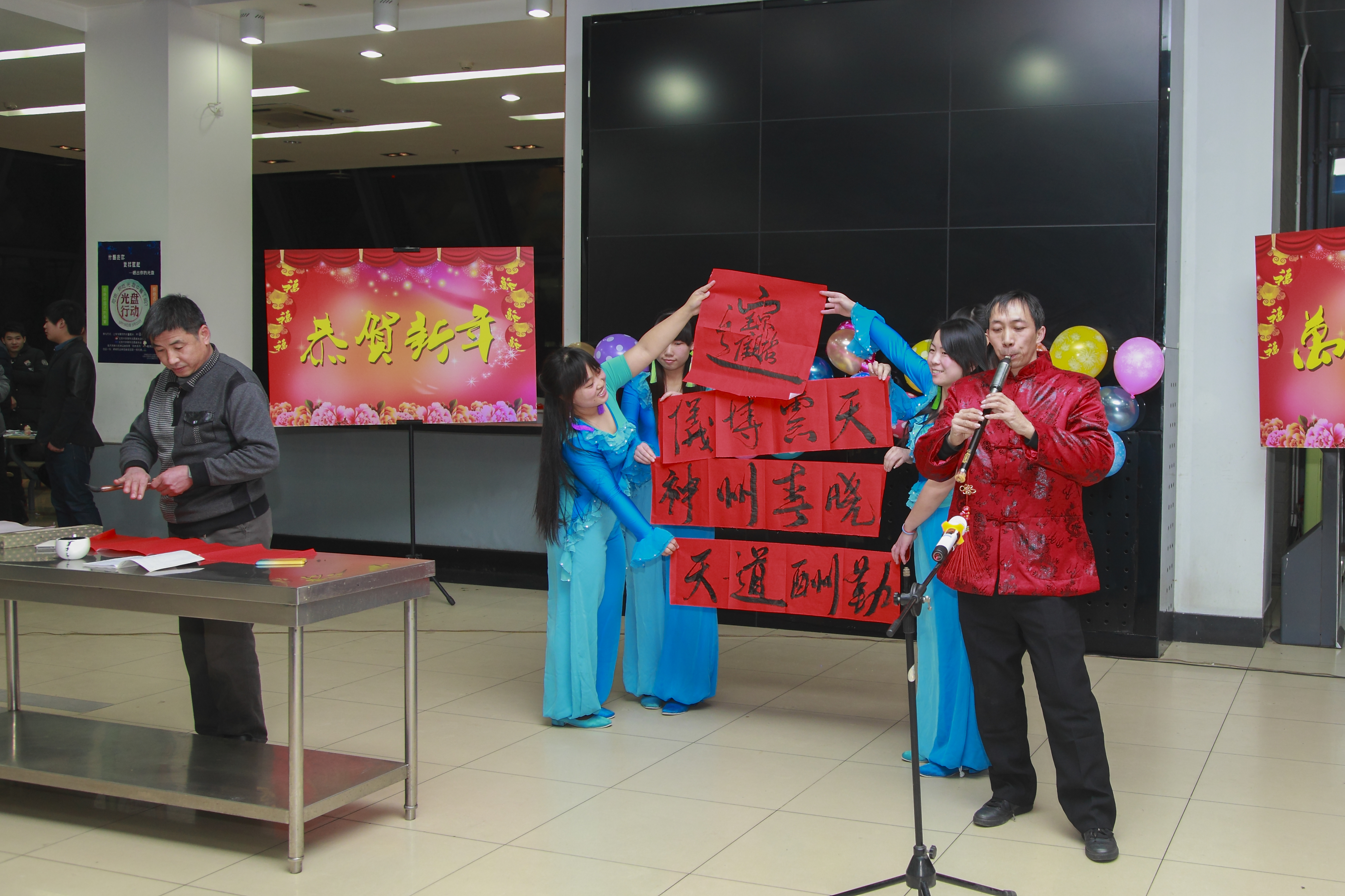来自各食堂的员工代表纷纷登场,奉上精彩节目。歌曲《父亲》、舞蹈《爷爷奶奶和我们》表达了对亲人的思念、渴望团圆的美好情感,展现了尽享天伦之乐的温馨场景;小品《服务的秘诀》幽默诙谐、笑点连连,令全场观众捧腹大笑;最美时光咖啡厅员工与北大同学共同表演的小合唱《最美时光》道出了“燕园师生缘、最美时光情”的美好情谊;《乐器巴乌配书法表演》这一极富特色的表演更是让在场的观众拍手叫绝……期间还穿插了观众互动活动,整台节目精彩纷呈、高潮迭起,持续了近2个小时,联欢会在农园食堂员工演唱的小合唱《明天会更好》的美好祝福中落下了帷幕。