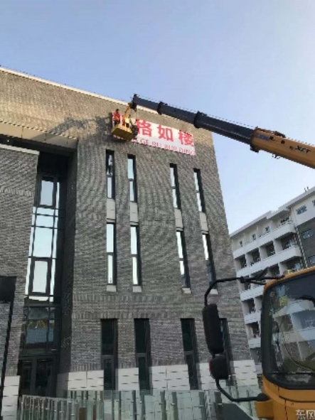 组织进行食堂外立面文字的高空安装作业