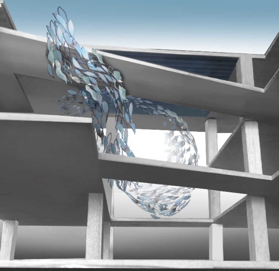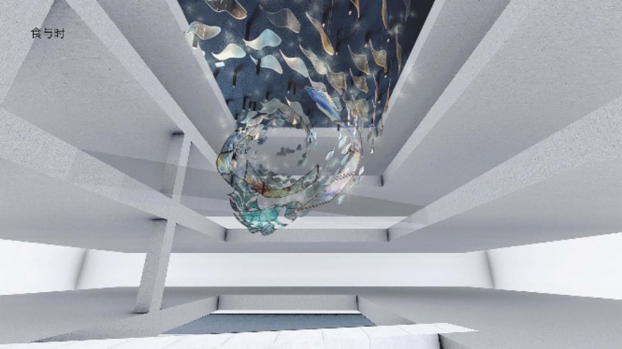 在食堂中厅,也曾探讨过以翻尾石鱼形象