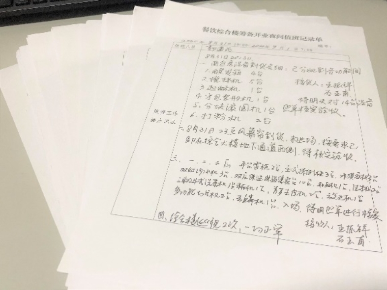 每位值班的干部都会认真填写餐饮综合楼开业筹备值班记录单