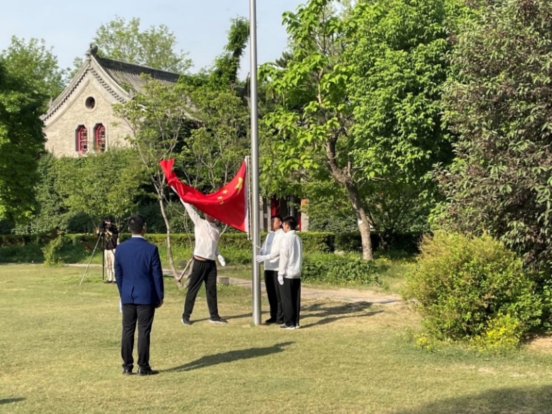 清晨的静园,微风徐徐,天蓝如海,映衬着五星红旗更加鲜艳夺目。承担本次升旗仪式的旗手们严阵以待。在雄壮嘹亮的中华人民共和国国歌声中,护旗手手动升旗,擎旗手将国旗从一角展开,在党员、群众的注视下,五星红旗冉冉升起,迎风飘扬在北大静园革命烈士纪念碑前,飘扬在北大餐饮人心中。