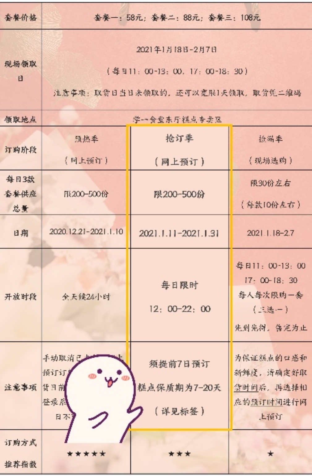 还有方法三:现场选购。前往学一食堂东厅糕点专卖区现场选购。每人每次限购一套(三选一)!先到先得,售完为止(记得带校园一卡通哦)。
