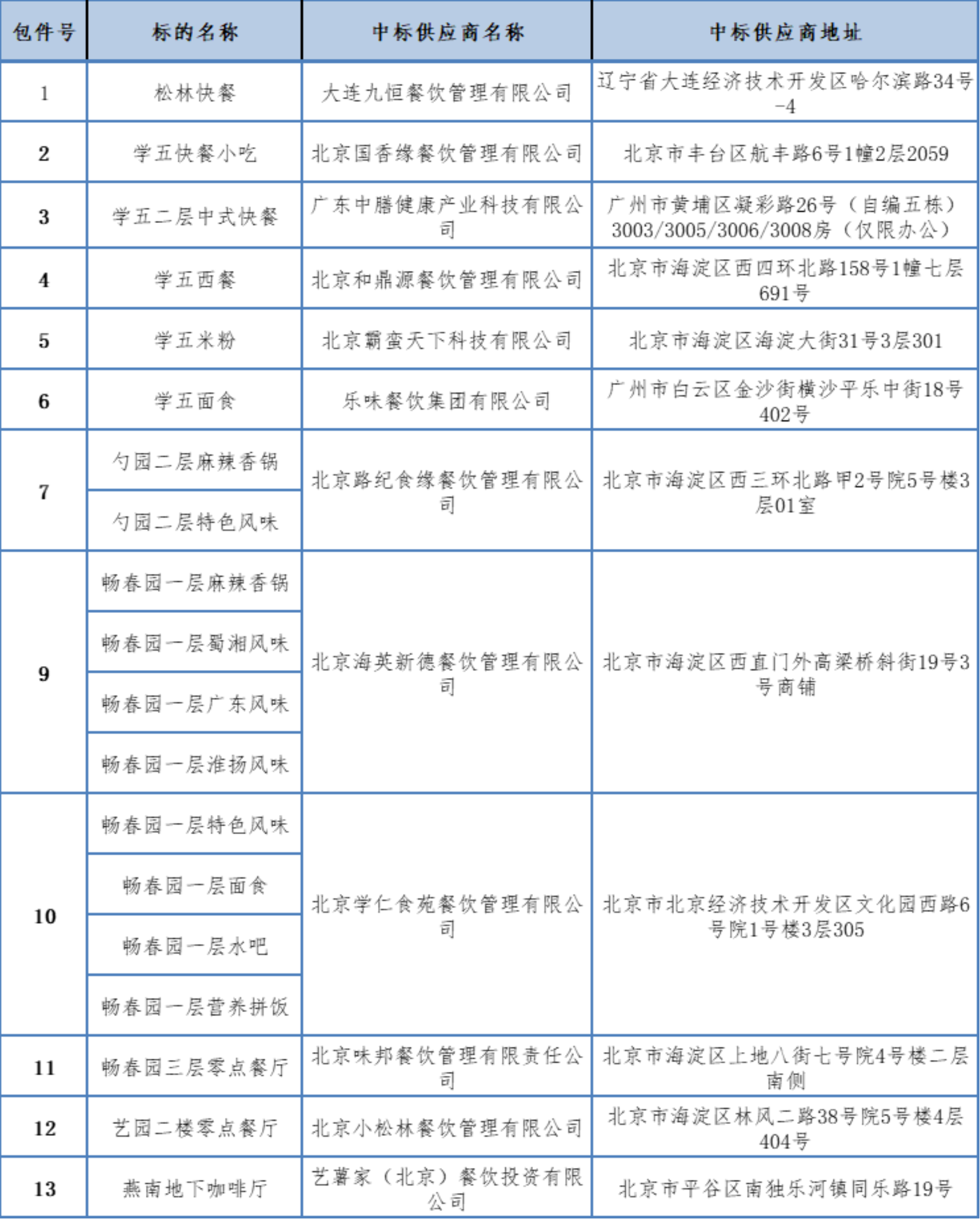 中贸国际工程招标(北京)有限公司受北京大学总务部委托,就北京大学餐饮服务合作经营项目(项目编号:CTIETC-FWZB-2306006)组织公开招标,公开招标工作已经结束,中标公告结果如下: